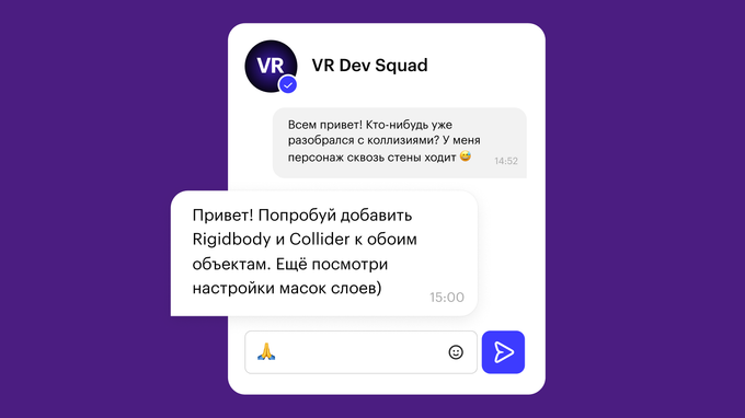 В Telegram-чате общаются эксперты и участники других курсов направления. Сможете узнать новости геймдева, обсудить сложные темы или задачи курса, а заодно найти партнёров для совместных проектов.